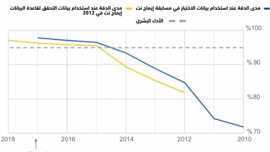 يتضمن التقرير عدة قياسات للتطور التكنولوجي، بما في ذلك دقة التعرف على الأجسام في الصور مقارنة بالأداء البشري المتوسط (في الأعلى) ودقة الترجمة الآلية للمقالات الإخبارية مقاسة بنتيجة يحددها مدقق بشري (في الأسفل)، ولكن هذه الأشكال لا تعني أننا اقتربنا من تطوير ذكاء اصطناعي بمستوى البشري، بل تبين كيف تم تحسين هذه التكنولوجيات الأساسية في السنوات الأخيرة.