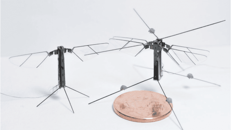 روبوت طائر رباعي الأجنحة (على اليمين) قرب تصميم ثنائي الأجنحة وعملة معدنية أميركية.