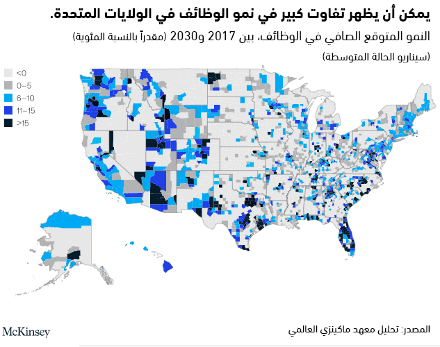 توجد بعض الأدلة في بحث من معهد ماكنزي الدولي حول مستقبل العمل في الولايات المتحدة؛ حيث بلغ التفاوت الاقتصادي درجةً عالية في الولايات المتحدة، ويظهر ذلك واضحاً في الاختلافات الحادة لسلامة ومسار الاقتصادات المحلية هناك بين مكان وآخر، مما يعني أن قوى الأتمتة ستؤثر على المستويات المحلية بطرق مختلفة للغاية. ولهذا، فإن استجابة الاقتصادات المحلية لتأثيرات الأتمتة ستؤثر بشكل كبير وبعيد الأمد على الشركات من حيث أماكن التوظيف، وأماكن توضّع العمليات، وأماكن الاستثمار، بل وحتى أماكن البحث عن الزبائن والعملاء.