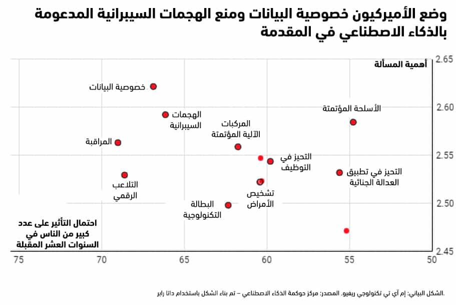 عندما طُلب من المشاركين ترتيب مخاوفهم، وضعوا ضعف خصوصية البيانات وتزايد تعقيد الهجمات السيبرانية في المقدمة، من حيث الأهمية ومن حيث احتمال تأثيرهما على الكثير من الأميركيين خلال السنوات العشر المقبلة. جاءت الأسلحة المؤتمتة في المرتبة التالية مباشرة من حيث الأهمية ولكنها كانت أقل احتمالاً من حيث التأثير على نطاق واسع.