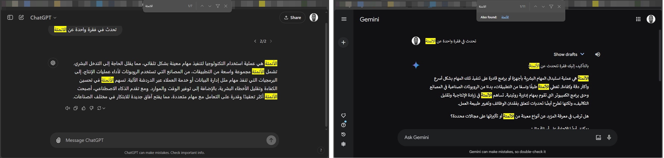 في حالة مطالبة بوتات الدردشة التوليدية بتوليد نصوص عميقة أو محتوى أكثر إبداعاً متعلق بموضوع محدد، فإن المقارنة أمر ضروري للغاية لتجنب الوقوع في فخ النسخ واللصق. في الحقيقة لن تُنشئ لك بوتات الدردشة محتوى من العدم، بدلاً من ذلك سيحاول بوت الدردشة جمع العديد من النصوص المدرب عليه سابقاً من مصادر مختلفة وتلخيصها ووضعها في سياق سهل الفهم.