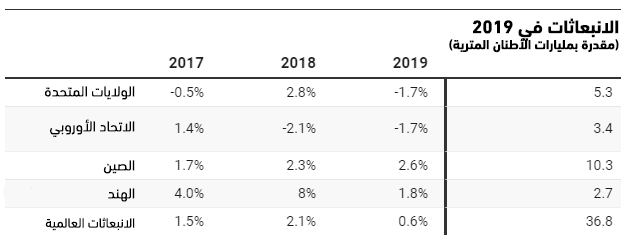 وستزداد الانبعاثات العالمية من ثاني أكسيد الكربون الناتج عن الوقود الأحفوري للسنة الثالثة على التوالي في 2019، وتُقدر هذه الزيادة بنسبة 0.6% أوصلت الانبعاثات إلى رقم قياسي غير مسبوق يساوي 37 مليار طن، وذلك وفقاً لتقرير سنوي دقيق من مشروع الكربون العالمي. كما أن الزيادات المتوقعة في الصين والهند وأجزاء أخرى من العالم -حيث يؤدي النمو الاقتصادي إلى زيادة الطلب على الطاقة- قد أدت إلى إزالة أثر الانخفاضات الطفيفة في الولايات المتحدة والاتحاد الأوروبي.
