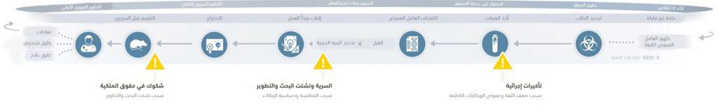 حسبما يظهر في الشكل 1، تبدأ السلسلة بالتعرف على ظهور المرض المعدي (ثانية) عبر المراقبة، يلي ذلك التحليل الأولي للعامل المسبب للمرض. هذا يتطلب الوصول إلى العينات البيولوجية، وتمكين تحديد صفات العامل الممرض. تشكل العينات والبيانات الجينية والبروتينية عوامل تُبنى عليها إجراءات الصحة العامة وعمليات البحث والتطوير الموجهة نحو الإجراءات الطبية المضادة للمرض.