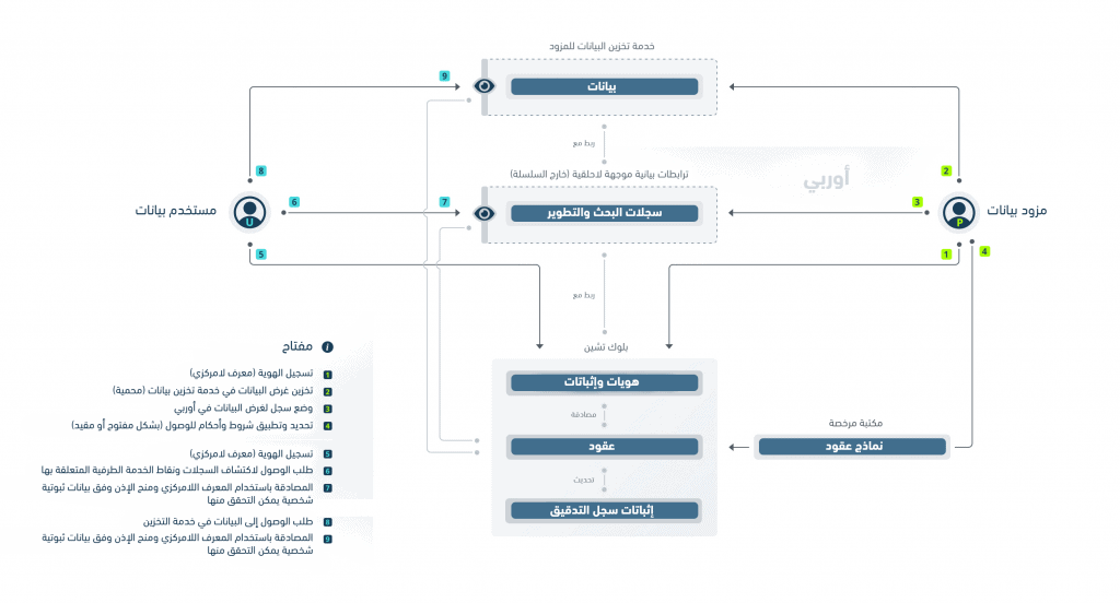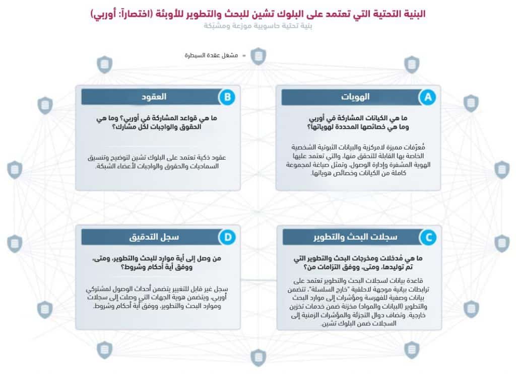سجلات البحث والتطوير: مخزن مقيد بالسماحيات لسجلات البحث والتطوير، ويحفظ في قاعدة بيانات خارج السلسلة، وهذه القاعدة مؤمثلة محلياً لتخزين الترابطات البيانية الموجهة اللاحلقية (اختصاراً: داج). تستخدم داج لربط السجلات، بحيث تجسد تطور وتفرع عملية البحث والتطوير مع مرور الزمن. يتم تنسيق الوصول إلى المخزن وسجلاته عن طريق العقود، وتتضمن السجلات بيانات وصفية ومؤشرات لتحديد الموارد المخزنة في خدمات السجلات (المفتوحة أو المقيدة) خارج أوربي. تضاف إلى هذه السجلات والموارد دوال تجزئة ومؤشرات زمنية في البلوك تشين لإثبات وجودها وصحتها.