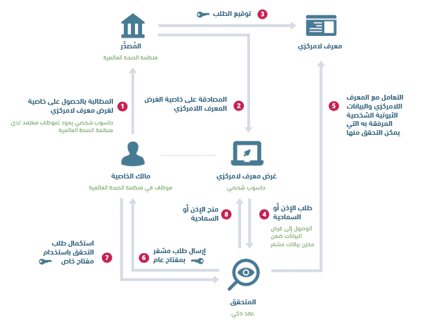 نعرض فيما يلي مثالاً يوضح آلية العمل، حيث يرمز اللون الأخضر لحالة تطبيقية تشترك فيها منظمة الصحة العالمية WHO.