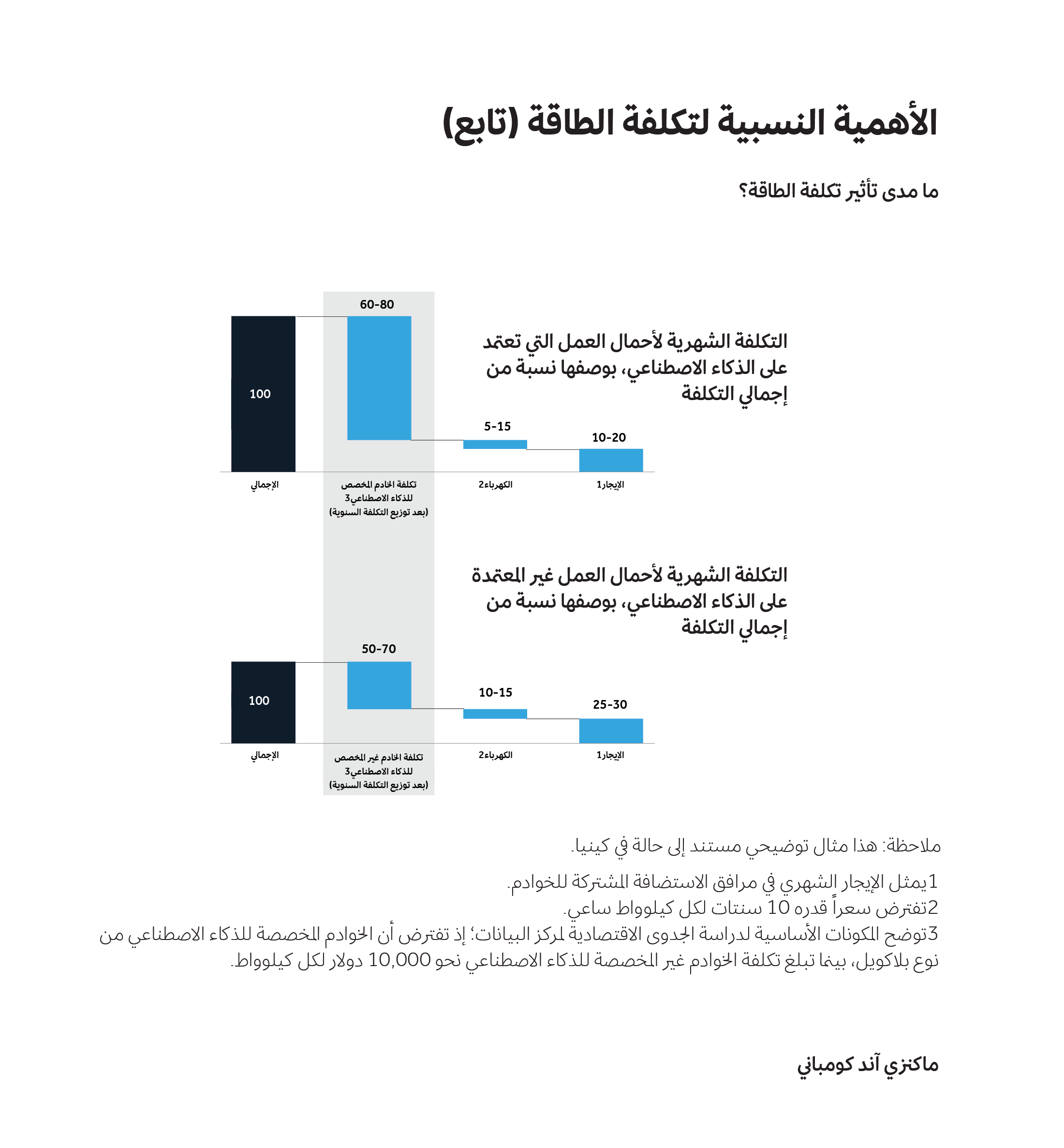 وعادة ما تمثل تكاليف الطاقة ما بين 5% و15% فقط من إجمالي التكلفة التي يتحملها عملاء الحوسبة السحابية على نطاق واسع. أما العوامل الأساسية المؤثرة في إجمالي تكلفة الملكية فتتمثل في الخوادم والرقائق الإلكترونية والمعدات الكهربائية وغيرها من الأجهزة (انظر الشكل). ويحقق خفض الرسوم الجمركية على استيراد المعدات والضرائب المحلية وتكاليف التوريد أثراً اقتصادياً أكبر بكثير من خفض بضعة سنتات في أسعار الطاقة، شريطة أن تبقى هذه الأسعار ضمن نطاق معقول. علاوة على ذلك، ولأن مراكز البيانات عادة تنقل تكلفة الطاقة إلى العملاء، فأثر تقلبات أسعار الطاقة محدود في اقتصاديات التشغيل لدى المشغلين.