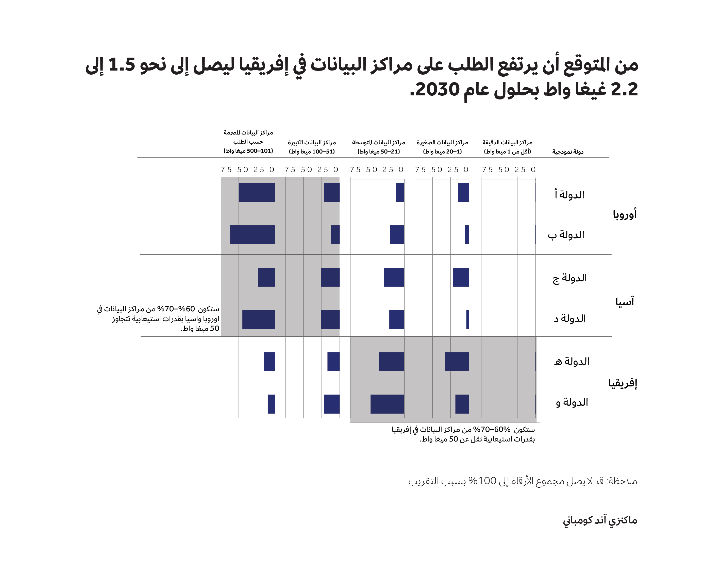 نظراً إلى أن الطلب على قدرات مراكز البيانات ما يزال مجزأً بين الدول، فضلاً عن عدم وضوح مسار نموه، فالنموذج الأنجح في إفريقيا هو النموذج الصغير المجزأ إلى وحدات والمنفذ على مراحل، مع وجود عميل رئيسي محوري يشكل قاعدة طلب مستقرة يمكن البناء عليها. ومن ثم، ستتركز القدرات الاستيعابية المنشأة بحلول عام 2030 ضمن الفئات الصغيرة والمتوسطة. وعلى خلاف بقية مناطق العالم، حيث يتوقع أن يكون ثلثا مشاريع مراكز البيانات الجديدة من الفئة الكبيرة إلى الضخمة جداً (بقدرات استيعابية تتراوح بين 50 و100 ميغا واط، أو بين 101 و500 ميغا واط للمجمعات الأكبر)، فثلثا المشاريع في إفريقيا سيقع ضمن الفئات الصغيرة (1 إلى 20 ميغا واط) والمتوسطة (20 إلى 50 ميغا واط) (انظر الشكل 2).