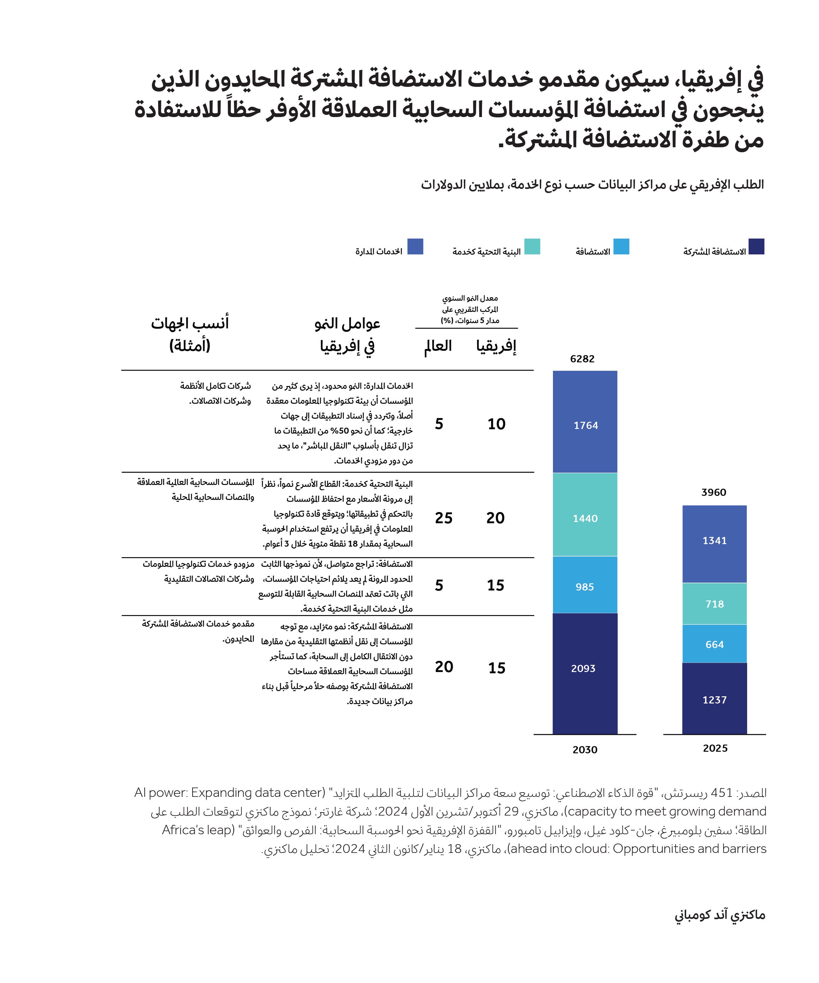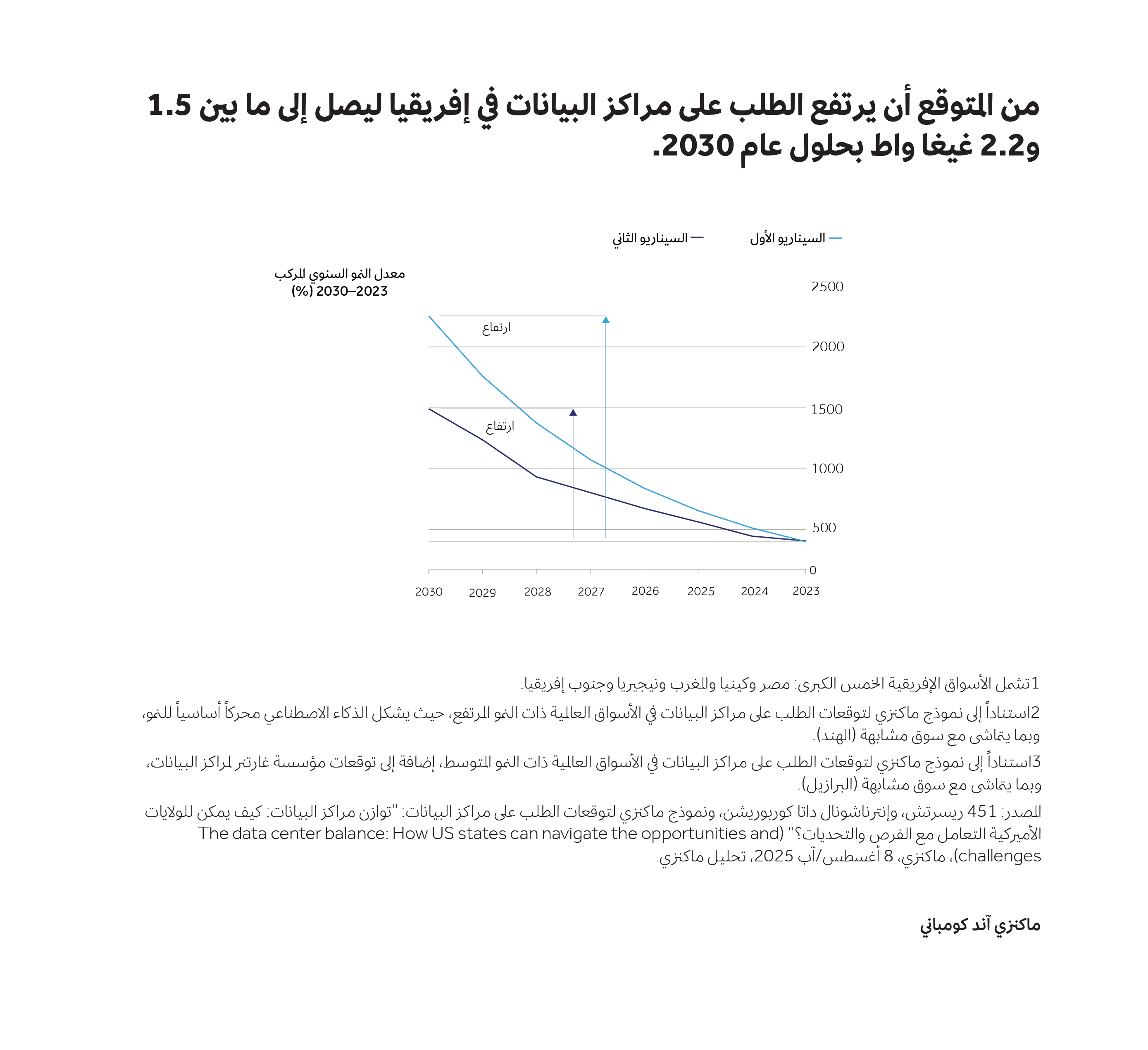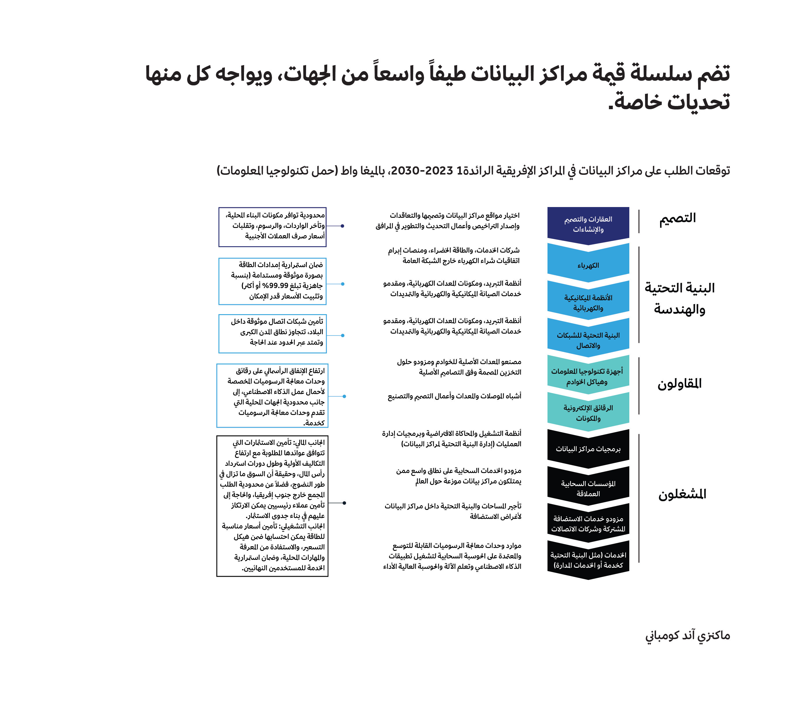 تدخل سوق مراكز البيانات في إفريقيا مرحلة من النمو المتسارع، فمن المتوقع أن يرتفع الطلب على القدرة الاستيعابية لمراكز البيانات من نحو 0.4 غيغا واط اليوم إلى ما بين 1.5 و2.2 غيغا واط بحلول عام 2030. وتمثل هذه السوق فرصة كبيرة، إذ تتطلب استثمارات جديدة تتراوح بين 10 و20 مليار دولار، ومن شأنها أن تولد عائدات تقدر بنحو 20 إلى 30 مليار دولار عبر سلسلة القيمة بحلول 2030. ولكن الأمور في إفريقيا ستكون مختلفة عنها في المناطق الأخرى؛ إذ لن يتقدم الطلب بالوتيرة نفسها في مختلف الأسواق، وستتأثر النتائج المتحققة بعدد من العوامل الهيكلية، مثل استقرار إمدادات الكهرباء والأطر التنظيمية وجاهزية البنية التحتية. وسيعتمد النجاح على تبني استراتيجيات مصممة بطريقة تراعي خصوصيات كل سوق ومواءمة الجهود بين المستثمرين والمشغلين وصانعي السياسات لتطوير نماذج تعكس الواقع المحلي وتستفيد في الوقت نفسه من أفضل الممارسات العالمية.