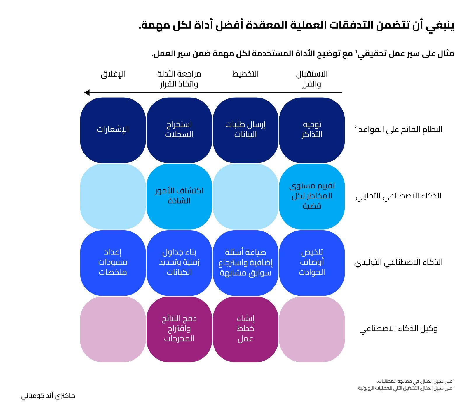 ومن المهم توضيح أن أنظمة الذكاء الاصطناعي ستتمكن بلا شك من إنجاز الكثير، لكن البشر سيظلون جزءاً أساسياً من معادلة العمل، حتى مع تغير طبيعة المهام التي يؤديها كل من الطرفين بمرور الوقت. فالبشر ستكون لهم أدوار محورية مثل مراقبة دقة النماذج، وضمان الالتزام بالقوانين، واستخدام القرار السليم، والتعامل مع الحالات الاستثنائية. وبالإضافة إلى ذلك، قد لا تكون الأنظمة دائماً هي الحل الأمثل، ما يستدعي وجود خبراء يستخدمون أدوات أخرى مثل نماذج التعلم الآلي. ومع ذلك، من المرجح أن يتغير عدد العاملين في أي سير عمل بعد إدخال هذه الأنظمة، وغالباً ما سينخفض مع اكتمال التحول. وهنا تظهر مسؤولية القادة في إدارة هذه المرحلة بحكمة، تماماً كما يفعلون مع أي برنامج تغييري آخر، مع التأكد من توزيع المهام اللازمة لتدريب الأنظمة وتقييم أدائها. ومن اللافت أن نجاح هذه التحولات يعتمد بدرجة كبيرة على التوازن بين كفاءة التكنولوجيا وخبرة البشر.