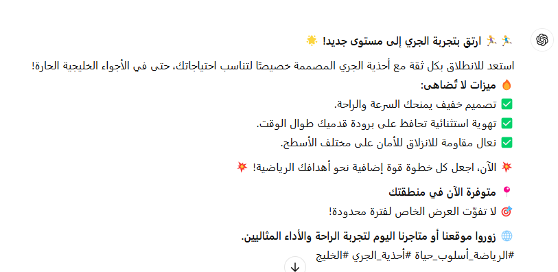 نحن علامة تجارية رياضية نرغب في الترويج لأحذية الجري. اكتب نصاً تسويقياً لنشره على وسائل التواصل الاجتماعي، يجب أن يكون النص مخصصاً للعملاء في منطقة الخليج العربي.