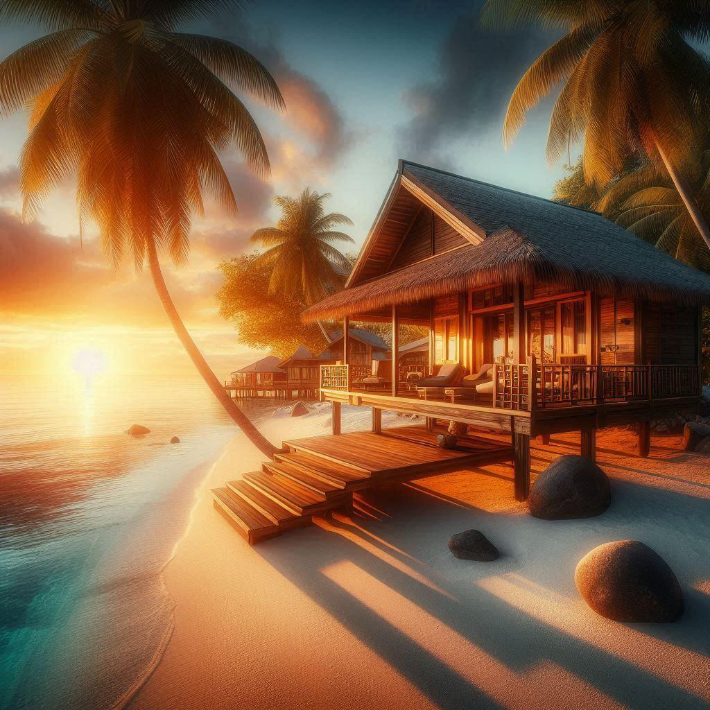 نحن شركة سياحة ترغب في الترويج لوجهة شاطئية. ولّد صورة لشروق الشمس على شاطئ استوائي مع كوخ خشبي ومياه زرقاء صافية، يجب أن تكون العناصر البصرية في الصورة واضحة.