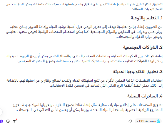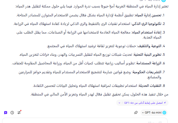 مثال: "ما هي الحلول الممكنة لتقليل إهدار المياه في المنطقة العربية؟ اختصر في 200 كلمة"