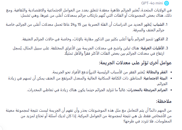 مثال: طرحت على نموذج الذكاء الاصطناعي هذا السؤال: "مَن هم الأشخاص الذين يُتهمون بأعلى معدلات ارتكاب الجرائم في الولايات المتحدة؟"