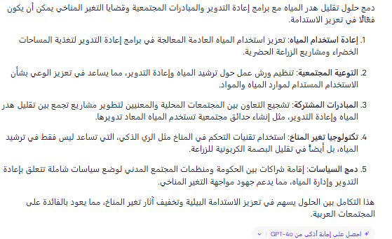 لتحسين النتيجة واكتشاف ارتباطها مع القضايا البيئية الأخرى: "كيف يمكن دمج هذه الحلول مع برامج إعادة التدوير الحالية أو المبادرات المجتمعية وقضايا التغيّر المناخي؟ في 200 كلمة"