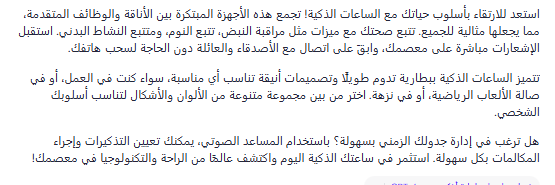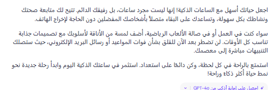 مثال: بدأت بالمطالبة التالية: "اكتب لي إعلاناً للترويج للساعات الذكية من 150 كلمة على الأكثر، دون كلمات حشو، ودون تفضيل لإحدى الشركات على أخرى"