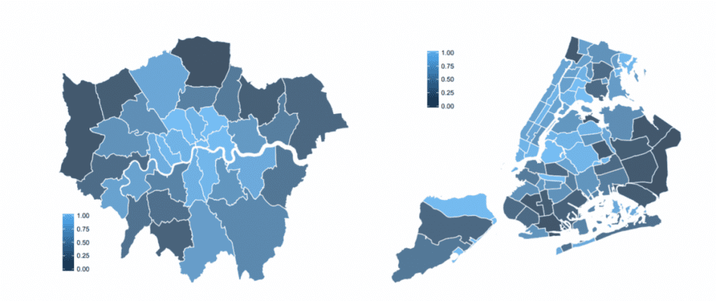 وسمحت خاصية الوسم الجغرافي للفريق بربط كل صورة بواحدة من المناطق الثلاث والثلاثين في لندن والمقاطعات المجتمعية البالغ عددها أكثر من 70 في نيويورك، ومنحهم ذلك القدرة على ترتيب ومقارنة التغييرات في النشاط الثقافي بمرور الوقت في هذه الأماكن. وتنشر هذه المدن أيضاً أرقاماً تتعلق بالتنمية الحضرية، مثل مؤشر الحرمان المتعدد في لندن ومؤشر الضعف الاجتماعي في نيويورك. كما تتوفر معلومات عن أسعار المنازل، والتي استخدمها الفريق كعلامة على ازدهار المدن.