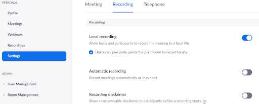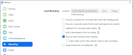 لكن قبل أن تبدأ بتسجيل الاجتماعات تأكد من ضبط الإعدادات اللازمة؛ إذ يجب أولاً التأكد من تفعيل خيار "التسجيل المحلي" -أي على جهازك- ضمن إعدادات الحساب على موقع زوم، التي يمكنك الوصول إليها ببساطة من خلال النقر على اسم المستخدم في نافذة التطبيق، فتظهر قائمة تختار منها "حسابي الشخصي". وعندما تفتح صفحة الحساب في المستعرض، قم باختيار "الإعدادات" ثم "التسجيلات" من أعلى الصفحة للتأكد من تفعيل خيار "التسجيل المحلي". بعد ذلك يجب ضبط الإعدادات المحلية على جهازك مثل المجلد الذي سيتم فيه حفظ ملفات الاجتماعات، من خلال النقر على "الإعدادات" في نفس القائمة السابقة ضمن نافذة التطبيق.