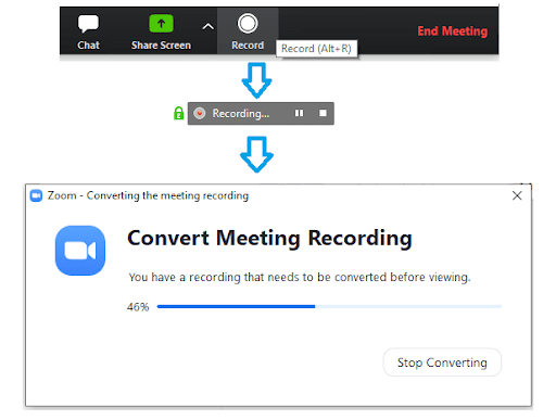 ولتسجيل الاجتماع، انقر على زر التسجيل الموجود في أسفل نافذة الاجتماع ضمن شريط الأدوات. عندها ستظهر أيقونة في أعلى نافذة الاتصال تشير إلى أنه يجري تسجيل المكالمة. وسيكون التسجيل جاهزاً بصيغة mp4 بمجرد انتهاء الاجتماع في حال اخترت حفظ التسجيل على حاسوبك. أما إذا اخترت حفظ التسجيل في السحابة، فسيصلك بريد إلكتروني بعد انتهاء الاجتماع يحتوي على رابط التسجيل المحمي بكلمة مرور، الذي يمكن مشاركته مع الآخرين.