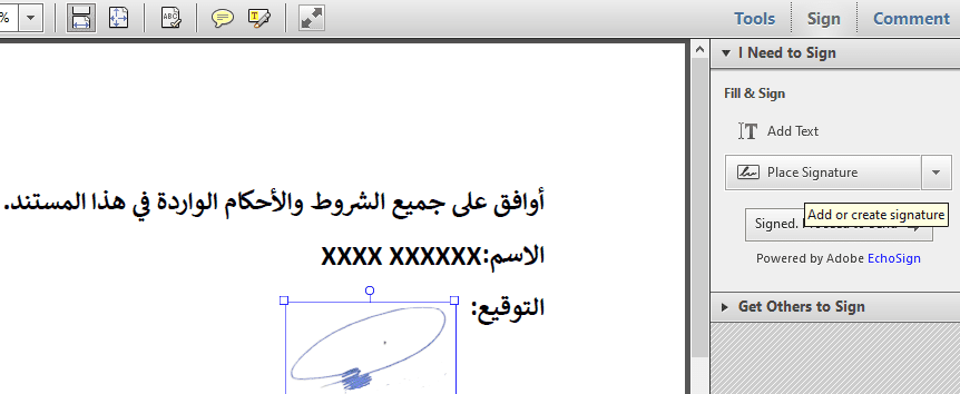 يمكن استخدام البرنامج الشهير أدوبي أكروبات ريدر Adobe Acrobat Reader للتوقيع من خلال فتح المستند في هذا البرنامج ثم اختيار توقيع (Sign) من شريط الأدوات في أعلى يمين البرنامج. وتضغط على وضع التوقيع (Place signature) ليتيح لك اختيار صورة توقيعك وإضافته إلى المستند في المكان الذي تريده.