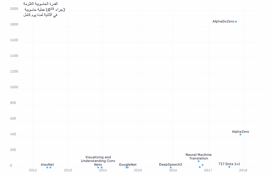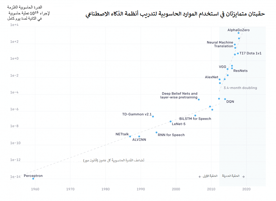 في عام 2018، وجد مختبر أوبن إيه آي أنَّ كمية القدرة الحاسوبية المستخدمة لتدريب أكبرَ نماذج الذكاء الاصطناعي قد تضاعفت كل 3.4 شهراً منذ عام 2012.