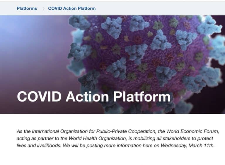 أعلن المنتدى الاقتصادي العالمي، بصفته شريكاً لمنظمة الصحة العالمية عن إطلاق منصة عمل "كوفيد" التي تهدف إلى تحفيز دعم القطاع الخاص للصحة العالمية في مواجهة فيروس "كوفيد-19"، والقيام بذلك على النطاق والسرعة المطلوبة لحماية حياة الناس، وسبل العيش، بهدف إيجاد طرق للمساعدة في إنهاء حالة الطوارئ العالمية في أقرب وقت ممكن. وستركّز منصة العمل الخاصة بفيروس "كوفيد" على ثلاث أولويات: