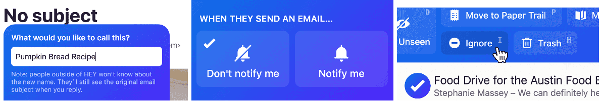 وفي حال استقبلت رسالة بريد إلكتروني تشكل متابعة لمناقشة سابقة عبر البريد الإلكتروني، فيمكنك إضافة هذه الرسالة إلى السلسلة حتى تظهر ضمن عنوان واحد في صندوق بريدك. وعلاوة على ذلك، تتيح خدمة Hey تخصيص إشعارات وصول بريد جديد تبعاً للجهة المرسلة. بالإضافة إلى ميزة القصاصات (Clips) التي تتيح للمستخدم تحديد المعلومات المهمة التي يرغب في الاطلاع عليها لاحقاً -مثل رقم هاتف أو عنوان- ضمن أي رسالة بريد إلكتروني، لتقوم خدمة Hey بوضعها ضمن مكتبة القصاصات للاطلاع عليها فيما بعد.