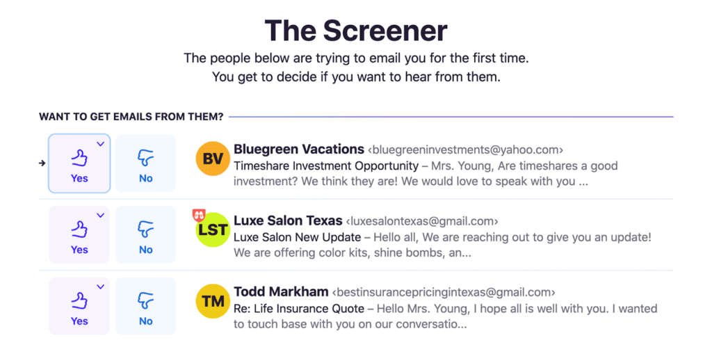 عندما يرسل إليك أحدهم بريداً إلكترونياً إلى عنوانك على Hey للمرة الأولى، فإن الرسالة لا تصل مباشرة إلى صندوق الوارد. عوضاً عن ذلك تحط رحالها ضمن ما يسمى "الفاحص"، وهو مساحة تتيح لك تحديد إذا كنت ترغب في استقبال رسائل من الجهة المرسِلة أم لا. وفي حال الموافقة على استقبال البريد، ستصل رسائل هذه الجهة مباشرة إلى صندوقك الوارد من الآن فصاعداً. أما في حال الرفض، فلن تستقبل أي رسالة إلكترونية منها في المستقبل، مع إمكانية التراجع عن قرارك.