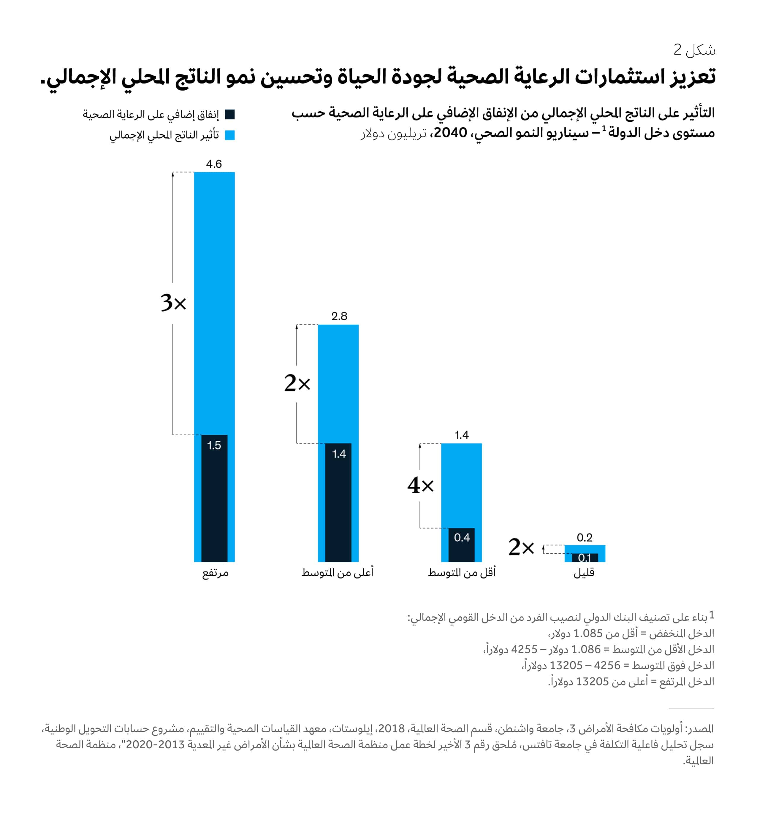 تستدعي الظروف إيجاد نهج متعدد الأوجه لمعالجة الأمور المتعلقة بالطلب المُتزايد وقيود إمدادات الرعاية الصحية والاستعداد للطوارئ، مع ضمان إيصال الرعاية العادلة لمستحقيها. لذا على القادة منح الأولوية للرعاية الصحية الوقائية والشاملة، لتعزيز الصحة وجودة الحياة – وردم الهوة البالغة 18 عاماً في متوسط الأعمار بين البلدان منخفضة الدخل والبلدان ذات الدخل المرتفع.