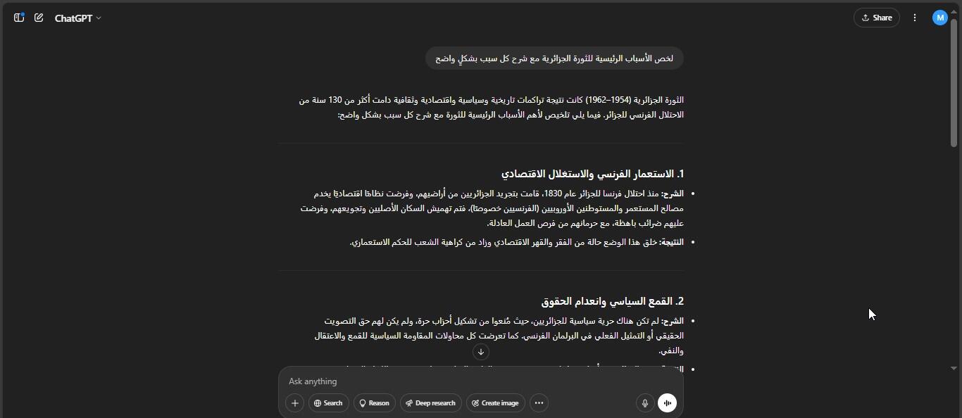 1- صياغة أسئلة واضحة ومحددة: من المرجّح أن تُسفر الأسئلة الغامضة أو العامة عن إجابات أقل صلة وفائدة. على سبيل المثال، بدلاً من طرح سؤال عام مثل: "أخبرني عن الثورة الجزائرية"، سيكون السؤال الأكثر فاعلية هو: "لخص الأسباب الرئيسية للثورة الجزائرية مع شرح كل سبب بشكلٍ واضح".