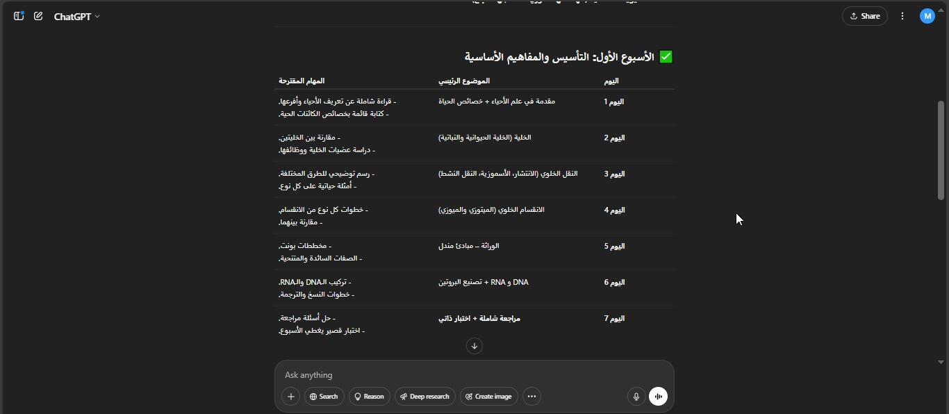 2- وضع خطة دراسية محددة: زوّد تشات جي بي تي بمواعيد امتحاناتك والمواضيع التي تريد دراستها لتحديد ما ينبغي لك دراسته كل يوم، واقتراح الوقت المُخصص لها، ما يضمن لك تغطية مجالات المادة الدراسية كلّها بطريقة منظمة. على سبيل المثال يمكنك مطالبته بـ: "ضع خطة دراسة مدة أسبوعين لمادة الأحياء المستوى الأول تُغطي المواضيع الرئيسية كلّها".