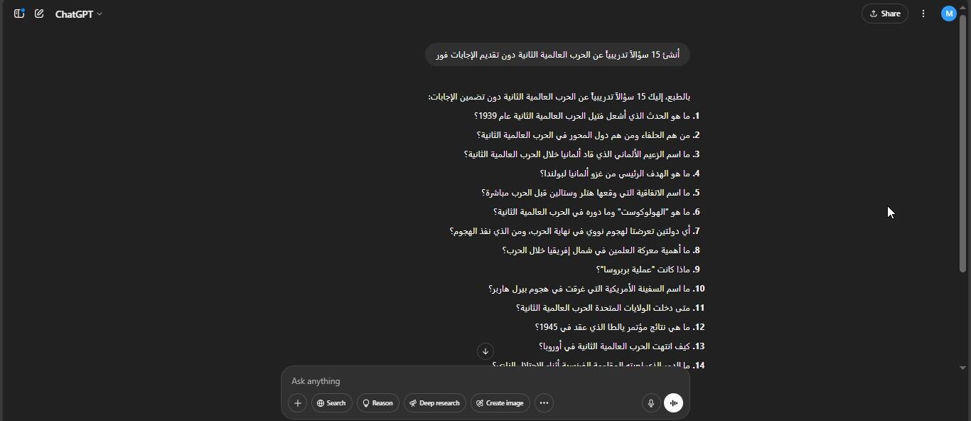 4- تحسين مهاراتك في الاسترجاع: يمكنك مطالبة تشات جي بي تي بإنشاء أسئلة تدريبية دون تقديم الإجابات فوراً، ما يُتيح لك اختبار قدرتك على التذكر، ثم مطالبته بكشف الإجابات الصحيحة لتقييم أدائك. على سبيل المثال: "أنشئ 15 سؤالاً تدريبياً عن الحرب العالمية الثانية دون تقديم الإجابات فوراً".