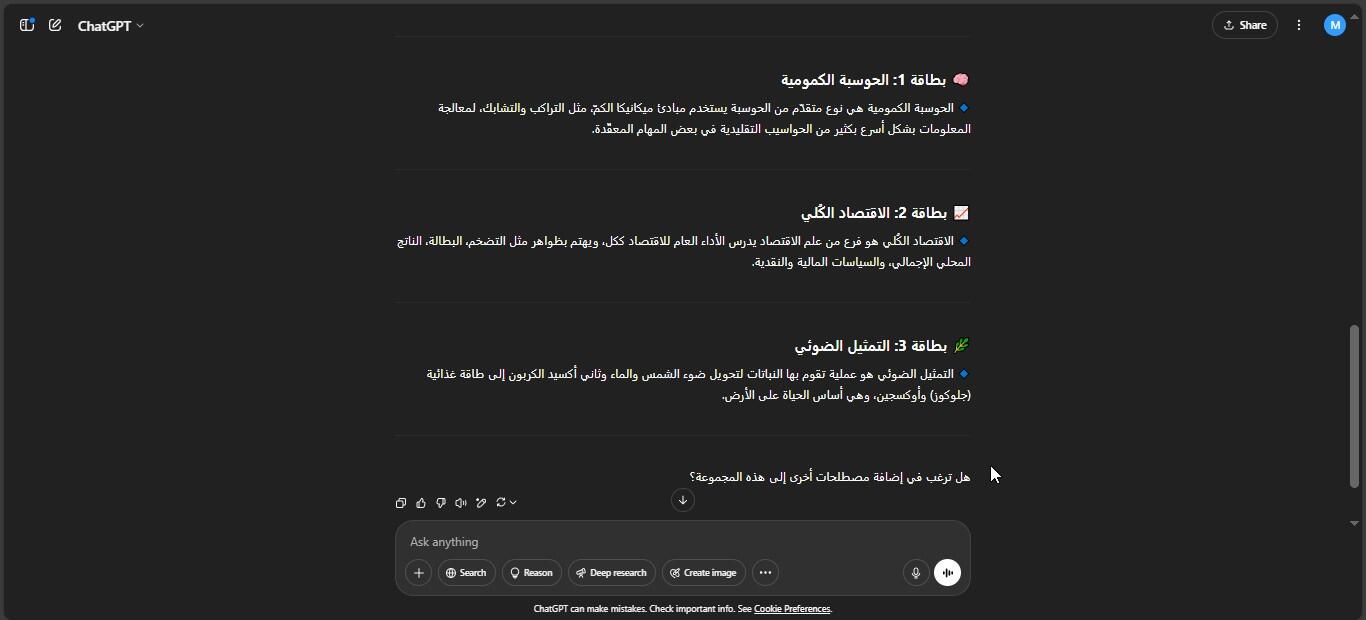 6- إنشاء بطاقات تعليمية: يمكنك مطالبة تشات جي بي تي لإنشاء بطاقات تعليمية مخصصة للمصطلحات الرئيسية أو التعريفات أو الصيغ التي تحتاج إلى حفظها من خلال تحديد التنسيق الذي تفضّله مثل المصطلح على جانب والتعريف على الجانب الآخر. على سبيل المثال: "أنشئ بطاقات تعليمية رقمية للمصطلحات التالية: الحوسبة الكمومية، الاقتصاد الكُلي، التمثيل الضوئي".