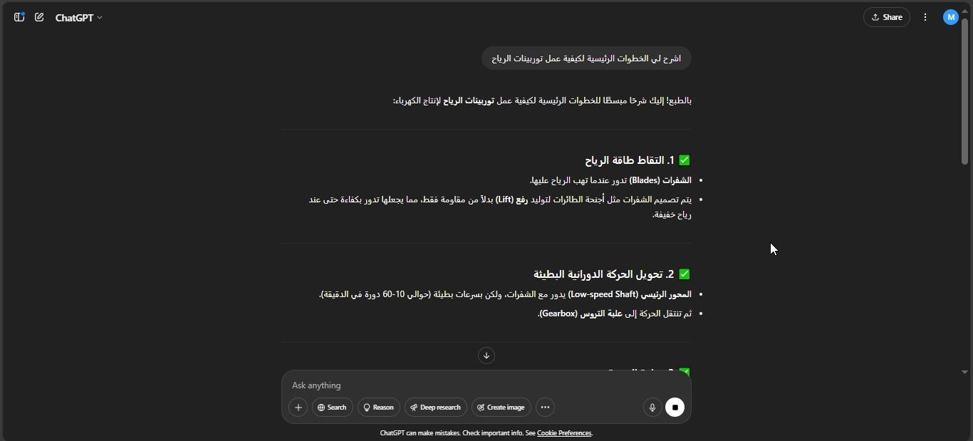 7- توضيح المفاهيم من خلال الأسئلة والأجوبة: إذا وجدت مفهوماً أو موضوعاً غير واضح، فاطلب من تشات جي بي تي شرحه لك. على سبيل المثال: "اشرح لي الخطوات الرئيسية لكيفية عمل توربينات الرياح"، كما يمكنك طرح أسئلة متابعة للتعمق أكثر مثل: "قدّم لي بعض الأمثلة؟"، ومن ثَمَّ من خلال الحوار التفاعلي يمكنك محاكاة الدروس الخصوصية وملء الفراغات.