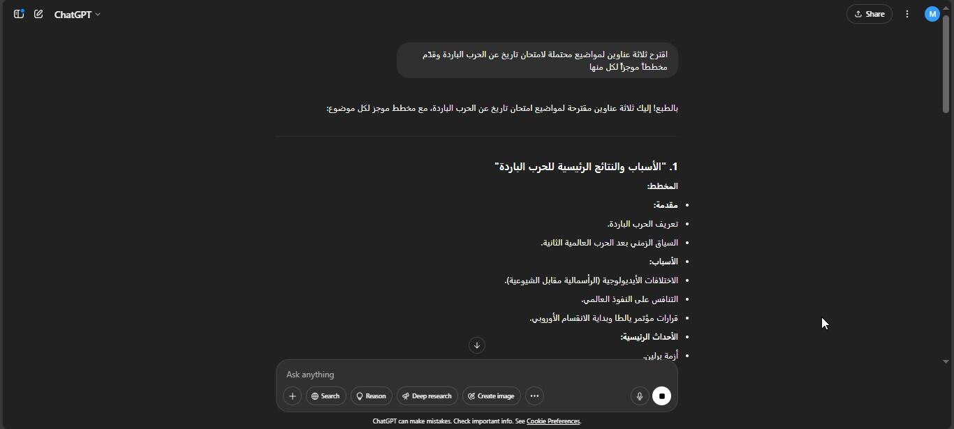 9- تبادل الأفكار: إذا كان امتحانك يتضمن كتابة مقال، فاستخدم تشات جي بي تي لتبادل الأفكار حول مواضيع المقالات المحتملة وصياغة عبارات قوية ووضع مخططات منظمة لتحسين عملية الكتابة. على سبيل المثال: "اقترح ثلاثة عناوين لمواضيع محتملة لامتحان تاريخ عن الحرب الباردة وقدّم مخططاً موجزاً لكل منها".