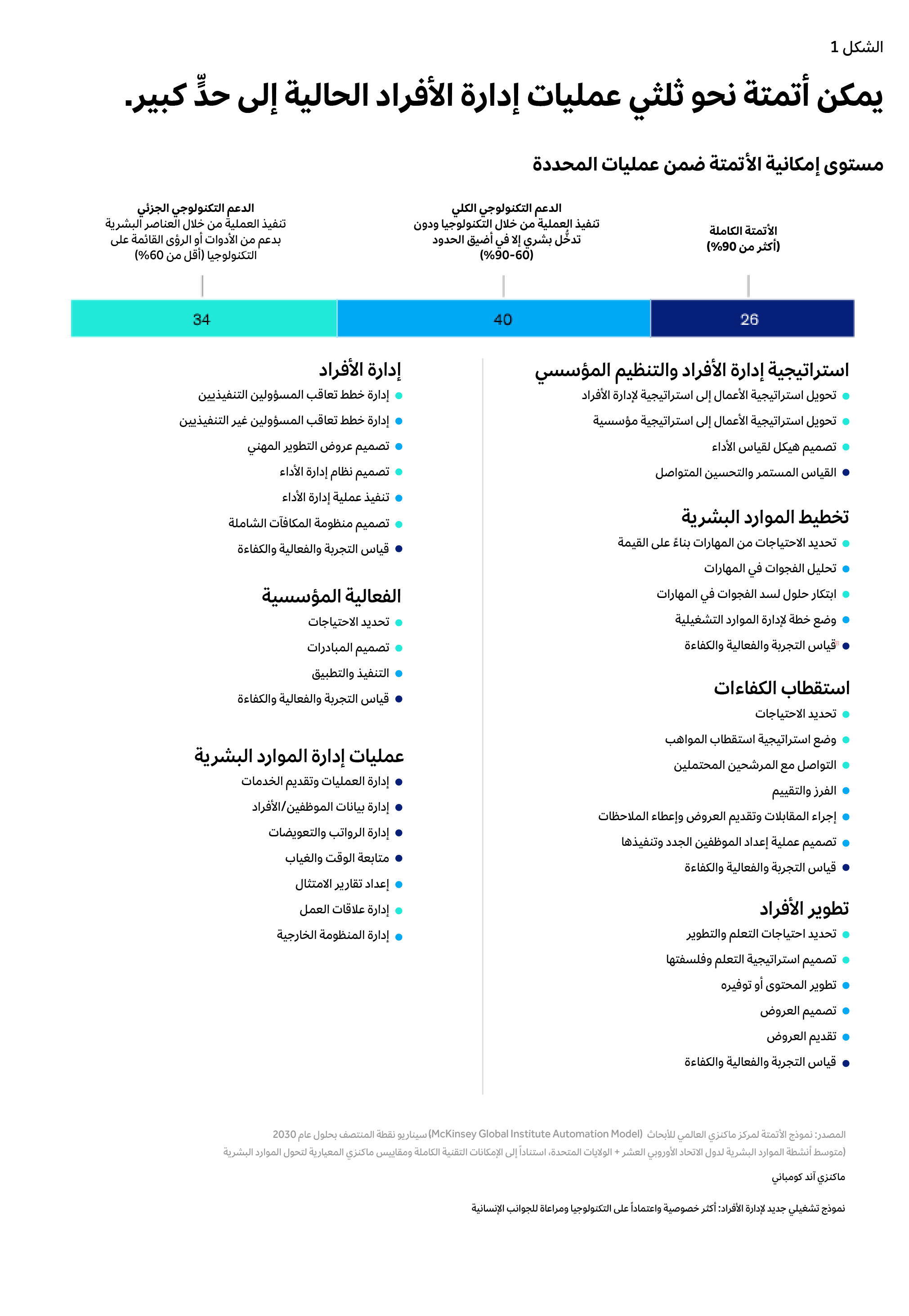 ستكون مهام إدارة الموارد البشرية أكثر تحديداً في المستقبل، بحيث تركّز بصورة أساسية على الاستراتيجية والأعمال. وتشير أبحاثنا إلى أن نحو 20% فقط من الأنشطة الاستراتيجية الحالية في الموارد البشرية ستبقى كما هي، بينما يمكن أتمتة نحو ثلثي المهام الحالية إلى حدٍّ كبير (انظر الشكل 1).