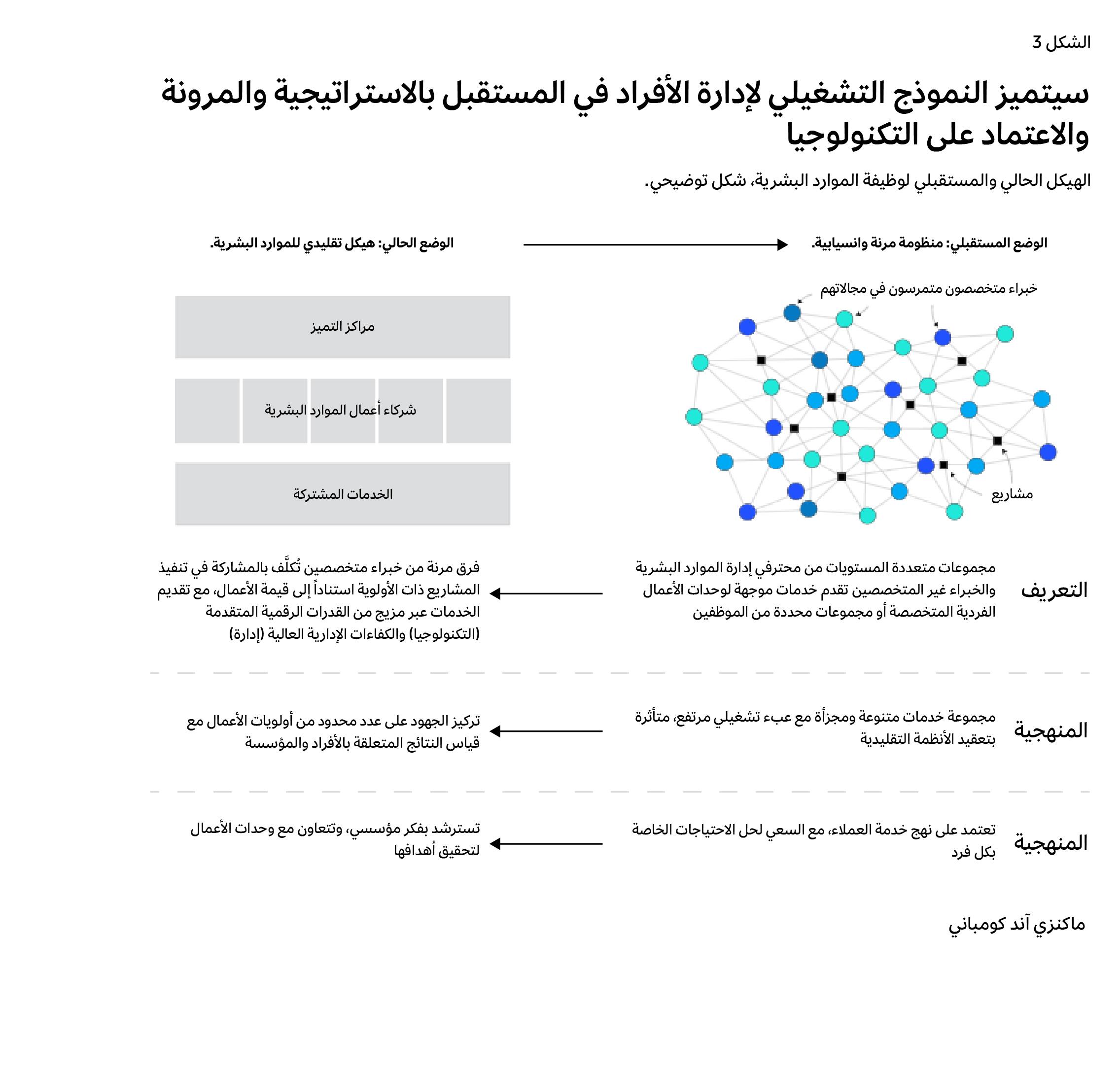 سيتطلب نموذج إدارة الأفراد في المستقبل نموذجاً تشغيلياً يضم مجموعة من الكفاءات أكثر رشاقة ومرونة، مع توزيع الخبراء على أولويات الأعمال الأكثر توليداً للقيمة، من خلال التعاون ضمن فرق تطوير الحلول. بموجب هذا النموذج الجديد، ستتطور مراكز التميز التقليدية إلى مجموعات خبرة افتراضية، حيث يتعاون علماء إدارة الأفراد مع خبراء من تخصصات أخرى لتنفيذ مشاريع ومنتجات وإجراءات تدخلية مشتركة بين عدة أقسام تركّز على تعزيز الصحة المؤسسية والفعالية التنظيمية. وبمجرد تحقيق نتيجة محددة، يُحلُّ الفريق ويُعاد توزيع أفراده على أولويات أخرى استناداً إلى مبدأ الربط بين مهارات الأفراد والقيمة التي تخلقها هذه المهارات للمؤسسة.