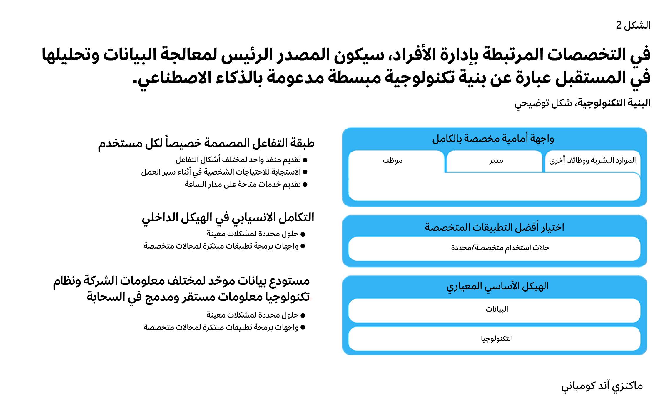 لتلبية احتياجات الأقسام المسؤولة عن إدارة الأفراد في المستقبل، على المؤسسات أن تستثمر في مستودعات مركزية للبيانات تتميز بالتكامل ووحدة المعايير وتضم مجموعة من المعلومات الحيوية المتعلقة بالأفراد وعمليات الشركة، وعليها أيضاً التحول من مزيج غير متكامل من الحلول الجزئية المكلفة إلى بنية تكنولوجية سحابية مدعومة بالذكاء الاصطناعي، مبسطة ومصممة لتناسب الغرض المطلوب (انظر الشكل 2).