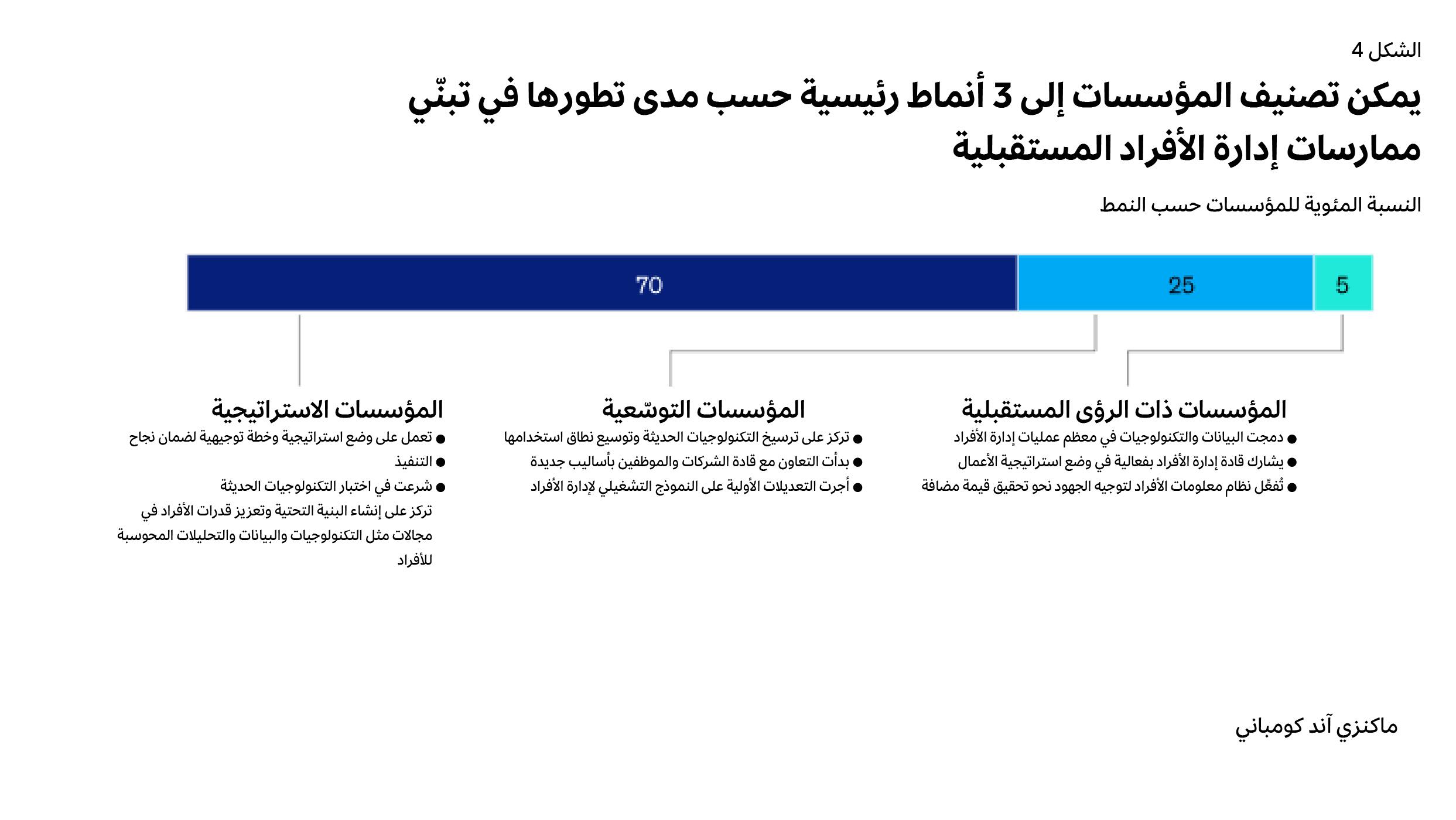 - بالنسبة للمؤسسات الاستراتيجية التي لا تزال في المراحل الأولية، تتمثل الخطوات الأولى في وضع رؤية واضحة وإعداد مبرر استثماري لتعزيز مهمة إدارة الأفراد من خلال الاستثمار في تكنولوجيات حديثة (مثل التحليلات المحوسبة للأفراد) وبناء القدرات؛ إذ تستطيع الشركات تحديد حالات الاستخدام وإطلاق مشاريع تجريبية والاستفادة من البيانات الناتجة عن تلك التجارب لتحديد القدرات المطلوبة.