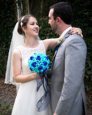 أما المشروع الذي استغرق أكبر قدر من الوقت فهو باقات الأزهار (لا تقلقوا، فلم أقم برميها إلى الخلف على عادة العرائس؛ لأنني لم أرغب بالقضاء على أحد أصدقائي بكتلة بلاستيكية عليها أزهار مدبَّبة). لقد قمت بطباعة 200 زهرة تقريباً بشكل منفرد على الآلات باستخدام أسلاك من البلاستيك الأزرق والفوسفوري، وأمضيت ما مجموعه مائة ساعة على مدى عدة أشهر، وأنا أطبع الزهور في أي وقت متاح بعد العمل وضمن عطل نهاية الأسبوع، ومن ثم قمت بتركيبها على كرات من الستيروفوم بالدبابيس والصمغ المستخدمين عادة في التزيين بالأزهار.