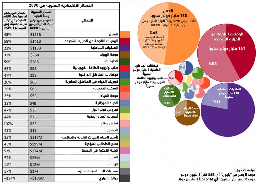 ستتحول الوفيات المبكرة إلى أحد أكبر مصادر التكاليف الاقتصادية للتغير المناخي المُتفلِّت في الولايات المتحدة، وذلك وفقاً لأحدث تقييم وطني مناخي، وهو عبارة عن مراجعة شاملة للمخاطر المناخية والإجراءات المتَّخَذة حيالها، وقد قامت بنشره مؤخراً مجموعة من الوكالات الفيدرالية الأميركية. وفي الفصل الأخير من التقرير، يُظهر شكلٌ بيانيٌّ أن الخسائر الاقتصادية السنوية من التغير المناخي قد تصل إلى 770 مليار دولار بحلول العام 2090، وذلك إذا لم تتمكن الدول من اتخاذ إجراءات فعالة لمواجهة المخاطر.