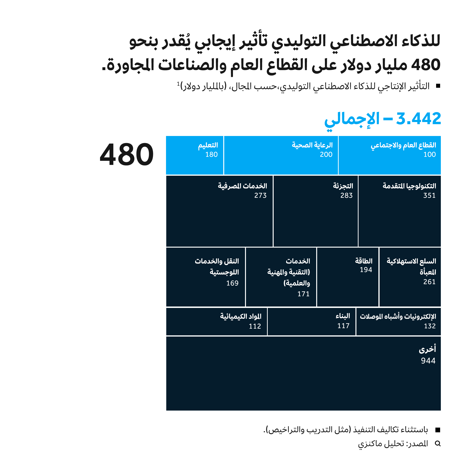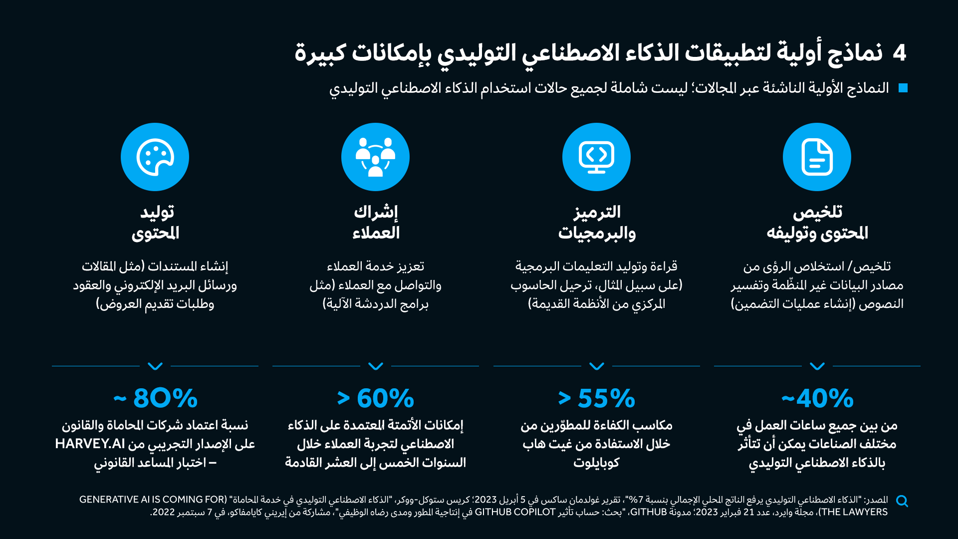 الذكاء الاصطناعي التوليدي، واستحواذها على اهتمام الرأي العام العالمي للمرة الأولى. ومع ذلك، تشير التوقعات للقيمة الاقتصادية للذكاء الاصطناعي التوليدي إلى تريليونات الدولارات سنوياً، حتى مع إثارة مخاطره قلق الشركات والمؤسسات والحكومات في أنحاء العالم كافة؛ وذلك لأن الذكاء الاصطناعي التوليدي يزوّد القادة الحكوميين بفرص فريدة لتوجيه جهود التنمية الاقتصادية الوطنية إلى المسار المطلوب (الشكل 1). وفي الوقت نفسه، يقع على عاتق هؤلاء القادة التحسب للجوانب السلبية للتكنولوجيا ووضع مبادئ توجيهية وقواعد تنظيمية دقيقة وصارمة يتحتم الامتثال لها.