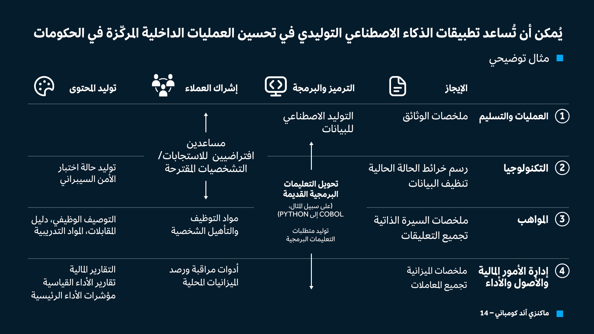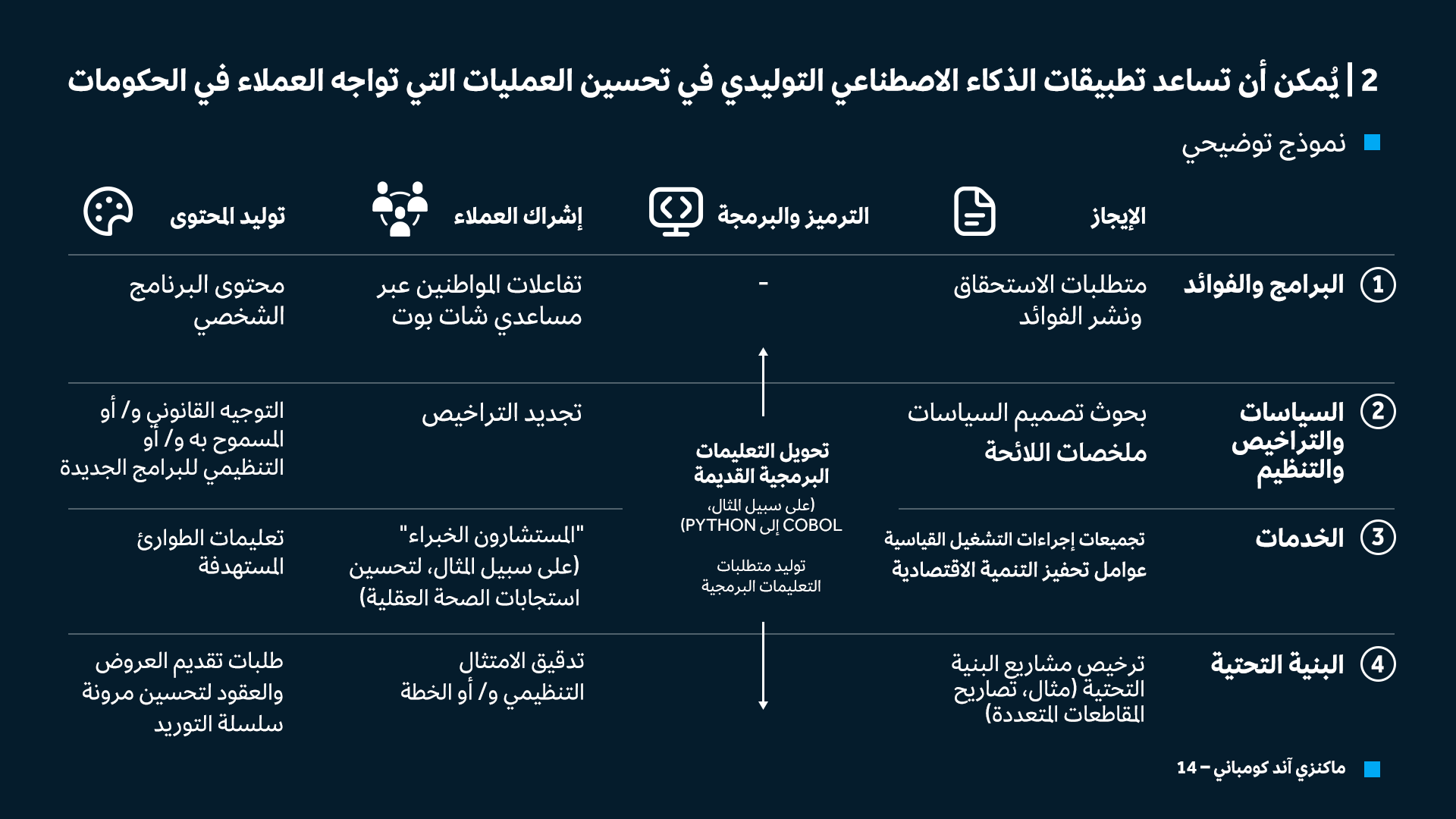 باعتبارها مزودَ خدمات رئيسياً للجمهور، فمن المرجح أن تولي الجهات الحكومية أهمية لتقديم هذه الخدمات كمجال حيوي للتحسينات المعتمدة على الذكاء الاصطناعي، وقد تكون أنسب بداية هي ما يُسمَّى بإطار 4Cs، الذي يضم أربع فئات مشتركة بين كافة القطاعات: تلخيص المحتوى وتكييفه، والترميز والبرمجيات، وإشراك العملاء، وإنشاء المحتوى (الشكل 2). ويندرج معظم تطبيقات الذكاء الاصطناعي التي شهدناها ضمن إحدى هذه الفئات الأربع، وهو ما ينطبق على مؤسسات القطاعين العام والخاص على حد سواء.