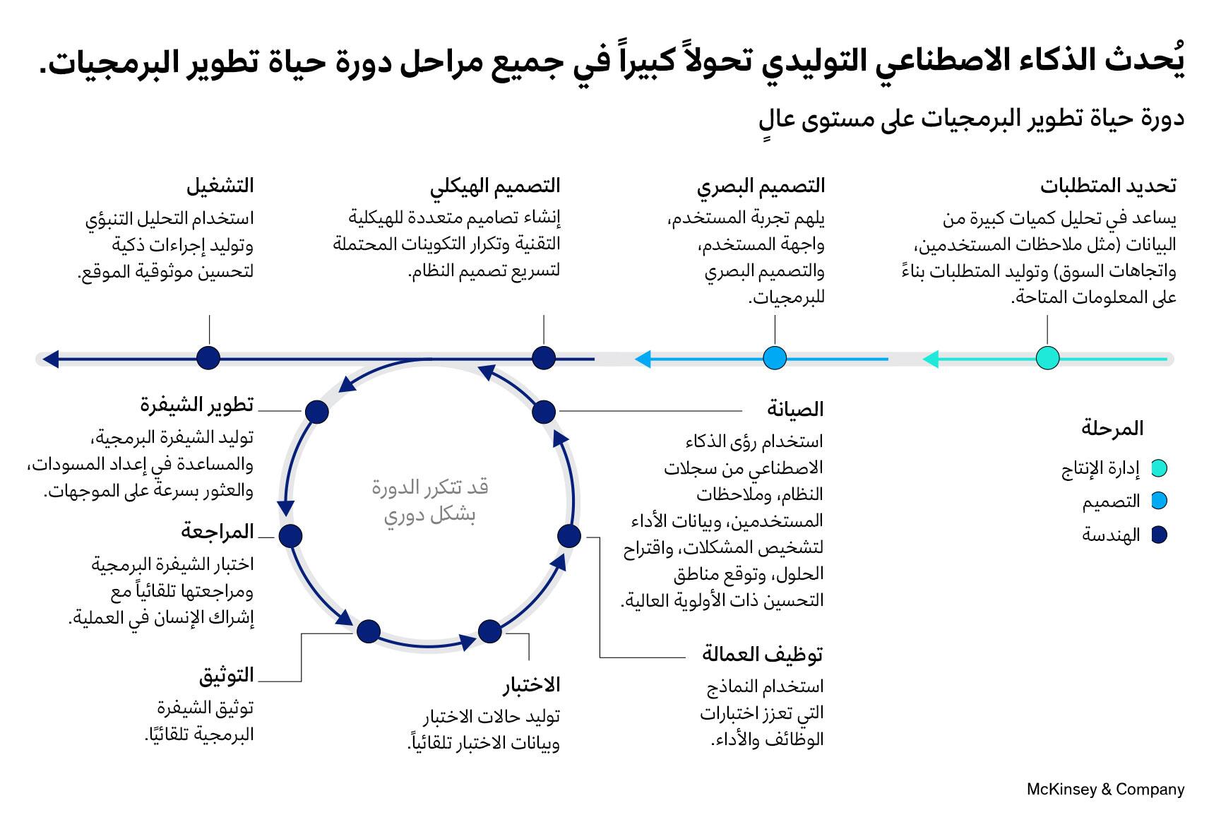 ملخص: تعتمد قدرة المنافسة في الاقتصاد الرقمي اليوم على مدى نضج الخدمات والمنتجات البرمجية التي تقدمها الشركات، تلك التي تُضفي القيمة وتبتكر وتحافظ على ريادتها. وتؤكد الأرقام ذلك؛ فقرابة 70% من الشركات المتفوقة، مقارنة بنصف عدد منافساتها، تعتمد على البرمجيات كأداة للتميّز في السوق، بل إن ثُلث تلك الشركات تحقق أرباحاً مباشرة من برمجياتها. والآن، مع ظهور الذكاء الاصطناعي التوليدي، تضاعفت الفرص لاستخدام البرمجيات بشكلٍ كبير لدفع النمو وتحسين الكفاءة. لفهم كيف سيحوّل الذكاء الاصطناعي التوليدي تطوير البرمجيات، علينا أولاً فهم كيف سيؤثّر في كل مرحلة من دورة حياة تطوير المنتج. وتؤكد دراسة حديثة من ماكنزي أن الذكاء الاصطناعي التوليدي له تأثير إيجابي مضاعف تقريباً في المهام ثقيلة المحتوى؛ مثل تلخيص المعلومات، وإنشاء المحتوى، والعصف الذهني، مقارنة بالمهام الأخف تقنية، مثل وضع تصور. كما أنه يتطلب من الكوادر تعلم مهارات لكل مرحلة من العمل، من مراجعة الأكواد، والربط والتصميم بالنسبة للمهندسين. وكيفية استخدام أدوات الذكاء الاصطناعي التوليدي، والأمان والثقة بالنسبة لمدراء المنتجات.