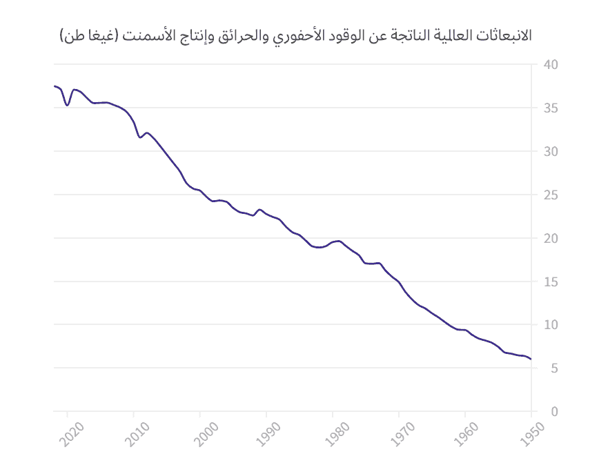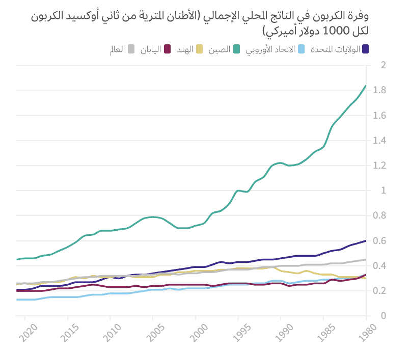 إن كثافة الانبعاثات الكربونية الناجمة عن النمو الاقتصادي على مستوى العالم آخذة بالتراجع مع مرور الوقت، ما يعني أن الانبعاثات الكربونية المقترنة بمستوى معين من النشاط الاقتصادي أصبحت أقل. وهو أمر صحيح على مستوى العالم، إضافة إلى الاقتصادات الكبيرة، مثل الولايات المتحدة والاتحاد الأوروبي. ويبدو هذا التوجه واضحاً بشكل خاص في الصين، حيث تراجعت كثافة الانبعاثات الكربونية للاقتصاد بنسبة 40% تقريباً منذ عام 2000.