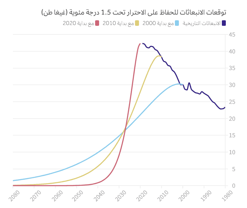 ولو بدأنا بتخفيف الانبعاثات في وقت أبكر، فمن المرجح أن هذه الميزانية كانت ستدوم فترة أطول، ما يسمح لنا بزيادة التدرج في التخفيف من الانبعاثات. ولكن في الوضع الحالي، وحتى نحافظ على الاحترار أقل من 1.5 درجة مئوية على مستوى العالم وفق الانبعاثات السابقة، يجب أن تصل الانبعاثات العالمية الإجمالية إلى الصفر بحلول عام 2050، كما يجب أن تصل إلى النصف تقريباً بحلول عام 2030. وقد لا يكون هذا حتى كافياً.