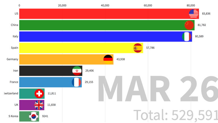 هذا رسم بياني متحرك يعتمد على نفس البيانات التي يستخدمها مركز علوم الأنظمة والهندسة بجامعة جونز هوبكنز لإعداد منصته، ويُظهر ازدياداً في عدد الحالات مع مرور الوقت بشكل متحرك. ما عليك سوى الضغط على زر التشغيل في أسفل اليسار لرؤية تطور الوضع مع مرور الوقت. ملاحظة: تعدّ البيانات دقيقة حتى 26 مارس، وهو اليوم الذي تفوّقت فيه الولايات المتحدة على الصين في عدد الحالات المبلغ عنها.