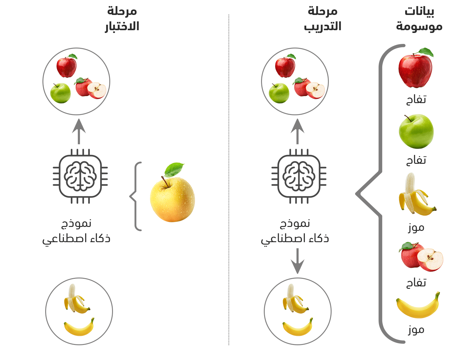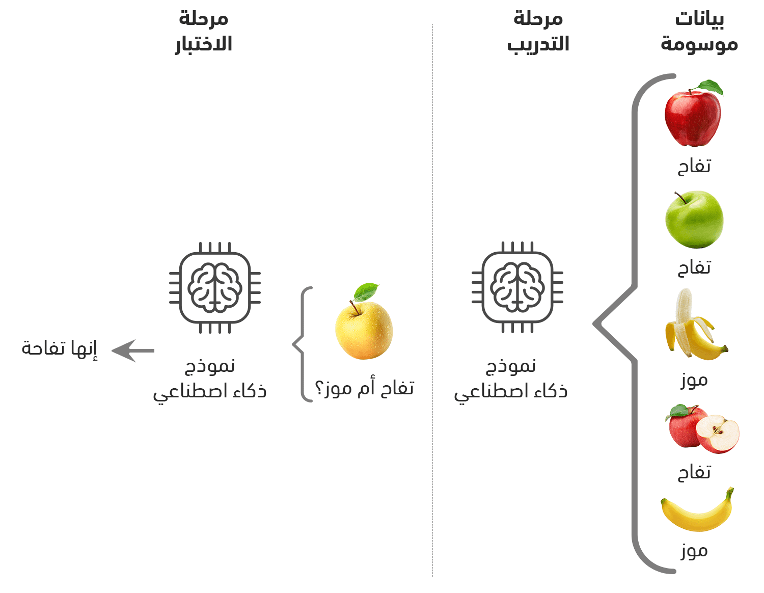 ولنوضح الفكرة بمثال: يتعلم الطفل التمييز بين الموز والتفاح من خلال مشاهدته لهما لمراتٍ متعددة فيتعلم أن يحدد فيما إذا كانت الفاكهة أمامه تفاحةً أم موزة. وبنفس الطريقة تتعلم الخوارزمية من خلال تدريبها على مجموعات من البيانات حتى تستطيع تعلم القواعد اللازمة لتتعرف على الأنماط فيها.