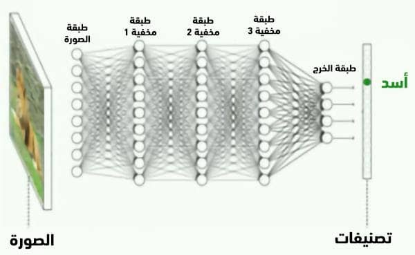 ولنوضح الفكرة بمثال، لنفرض أنك ترغب في بناء نظام يقوم بالتعرف على حيوانات مختلفة، بالتالي ستقوم بتلقيم الشبكة العصبونية بصور قطط وكلاب وأسود مرفقةً بأسمائها (بيانات موسومة، نعم إنها حالة تعلم موجَّه)، وحينها سيبدأ حل أحجية رياضية جنونية داخل الشبكة؛ حيث تقوم طبقات الشبكة العصبونية بتقسيم عملية التحويل إلى عدة خطوات، وتسمح للشبكة بإيجاد سلسلة من المعادلات التي تصف كل منها مرحلة من العملية. فتقوم الطبقة الأولى مثلاً بفحص كل البيكسلات وتستخدم معادلة لانتقاء البيكسلات الأكثر ارتباطاً بالكلاب والقطط والأسود، ويمكن أن تقوم طبقة أخرى ببناء أنماط أكبر من مجموعات البيكسلات حتى تكتشف مثلاً الشوارب أو الآذان، ويزداد تعقيد السمات الموصوفة مع تتابع الطبقات، إلى أن تقوم الطبقة الأخيرة باتخاذ القرار بناء على الحسابات المتراكمة. هذا التتابع يسمح للشبكة العصبونية ببناء نماذج أكثر تعقيداً، ومن ثم يتم تحويلها إلى توقعات أكثر دقة.