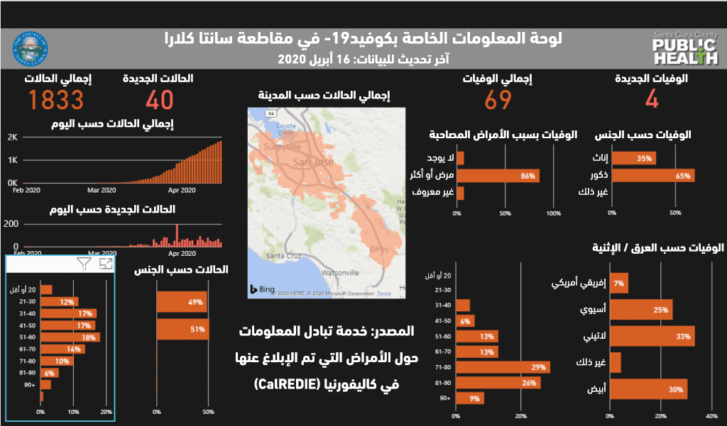 وتظهر لوحة المعلومات الخاصة بكوفيد-19 في مقاطعة سانتا كلارا وجود 1833 حالة إصابة مؤكدة و69 حالة وفاة حتى اليوم.