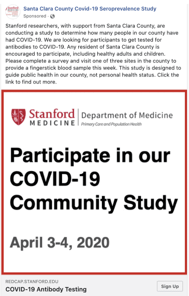 ويصف فريق جامعة ستانفورد عملهم بأنه "أول دراسة موسّعة عن التفشي المجتمعي للفيروس في إحدى المقاطعات الأميركية الرئيسية، يتم الانتهاء منها خلال جائحة تتغير بوتيرة متسارعة وباستخدام مجموعات اختبار أُتيحت منذ مدة قريبة".